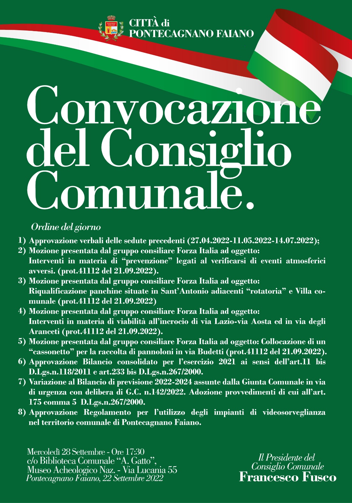 Si terrà il giorno 28 settembre 2022, alle ore 17:30, presso la Biblioteca Comunale “Alfonso Gatto” sita all’interno del Museo Archeologico “Etruschi di Frontiera” in Pontecagnano Faiano, il prossimo consiglio comunale.