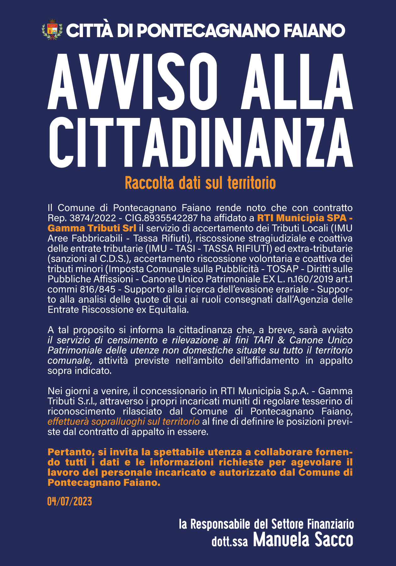 Il Comune di Pontecagnano Faiano rende noto che con contratto Rep. 3874/2022 - CIG.8935542287 ha affidato a RTI Municipia SPA - Gamma Tributi Srl il servizio di accertamento dei Tributi Locali (IMU Aree Fabbricabili - Tassa Rifiuti), riscossione stragiudiziale e coattiva delle entrate tributarie (IMU - TASI - TASSA RIFIUTI) ed extra-tributarie (sanzioni al C.D.S.), accertamento riscossione volontaria e coattiva dei tributi minori (Imposta Comunale sulla Pubblicità - TOSAP - Diritti sulle Pubbliche Affissioni - Canone Unico Patrimoniale EX L. n.160/2019 art.1 commi 816/845 - Supporto alla ricerca dell’evasione erariale - Supporto alla analisi delle quote di cui ai ruoli consegnati dall’Agenzia delle Entrate Riscossione ex Equitalia).
