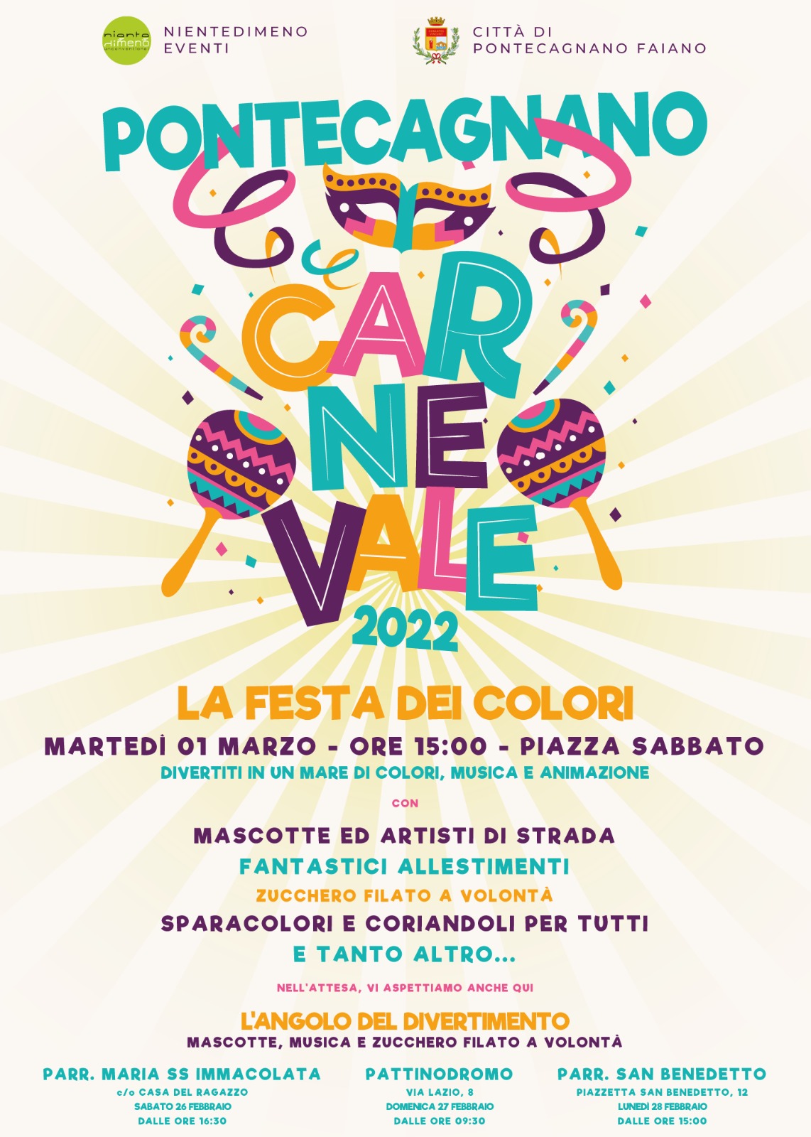 Il Carnevale si concluderà, a Pontecagnano Faiano, con una grande Festa dei colori organizzata martedì 1 marzo, dalle ore 15:00, in Piazza Sabbato. Per allietare le famiglie ed avvolgerle in un ‘atmosfera di allegria, sono previste mascotte, artisti di strada, allestimenti scenografici, zucchero filato, sparacoriandoli e coriandoli per tutti.