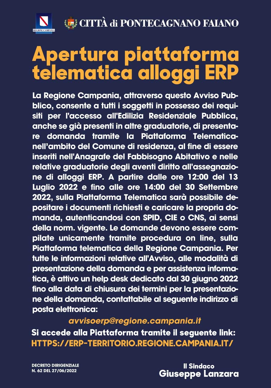 Le richieste possono essere compilate unicamente tramite procedura on line, sulla Piattaforma telematica della Regione Campania a cui si accede tramite il link erp-territorio.regione.campania.it o collegandosi al sito comune.pontecagnanofaiano.sa.it.