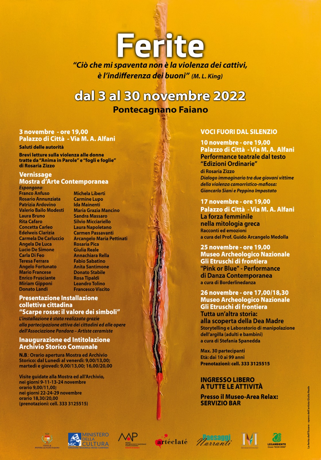 Dal 3 al 30 novembre si terrà a Pontecagnano Faiano l’iniziativa Ferite: una rassegna di eventi artistici e culturali dedicata al tema della violenza.