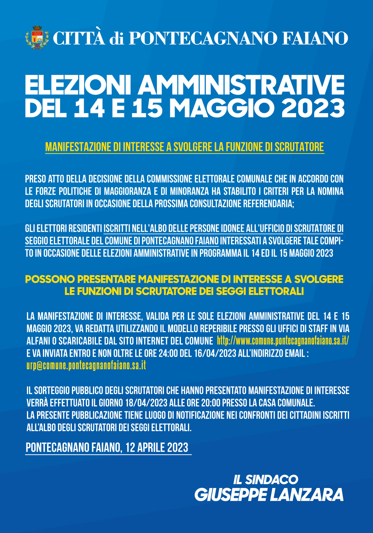 Gli elettori residenti ISCRITTI NELL'ALBO DELLE PERSONE IDONEE ALL'UFFICIO DI SCRUTATORE DI SEGGIO ELETTORALE DEL COMUNE DI PONTECAGNANO FAIANO interessati a svolgere tale compito in occasione delle Elezioni Amministrative in programma il 14 ed il 15 Maggio 2023