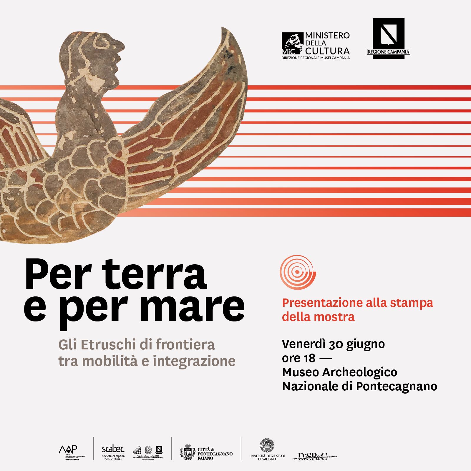 L'evento, che si aprirà alle 18.00 presso la sede del Museo Nazionale Archeologico Etruschi di Frontiera, porta la firma di Carmine Pellegrino e Luigina Tomay ed è stato organizzato dalla Direzione Regionale Musei Campania diretta da Marta Ragozzino, con il supporto della Regione Campania attraverso la Scabec, in collaborazione con l'Università degli Studi di Salerno ed il patrocinio del Comune di Pontecagnano Faiano.