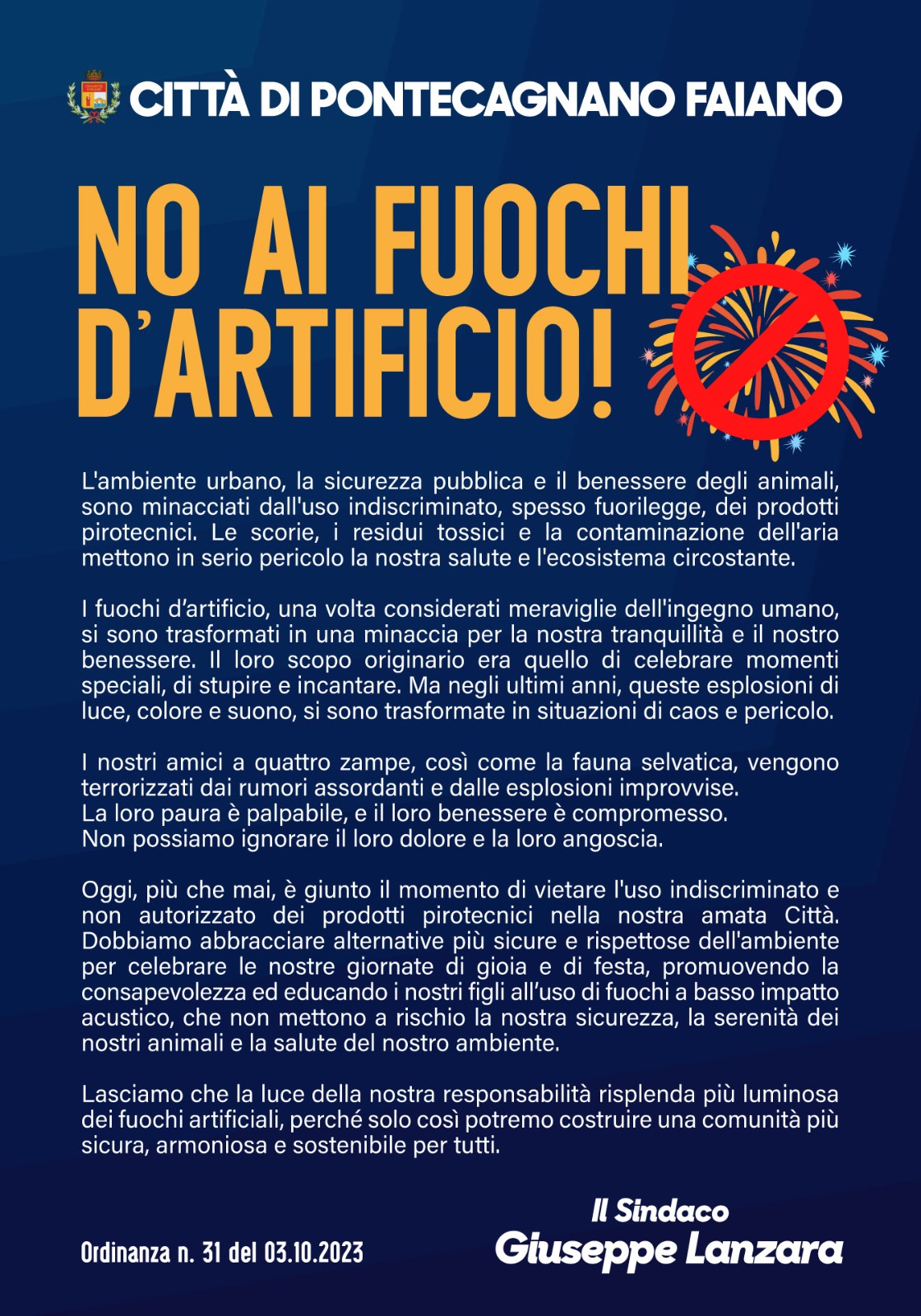 Il Sindaco Giuseppe Lanzara, con ordinanza n. 31 del 03.10.2023, ha disposto il divieto dell’accensione e del lancio di fuochi d’artificio e di razzi, dello sparo di petardi e dello scoppio di bombette, razzi ed altri artifici pirotecnici in tutto il territorio comunale.