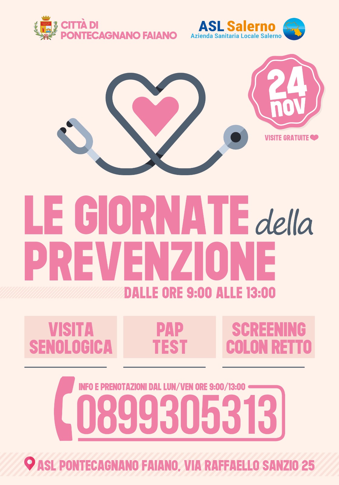 Il Comune di Pontecagnano Faiano e l’Asl Salerno hanno messo a disposizione medici specialisti per fornire, a titolo gratuito, visite senologiche, pap, test e screening del colon retto.