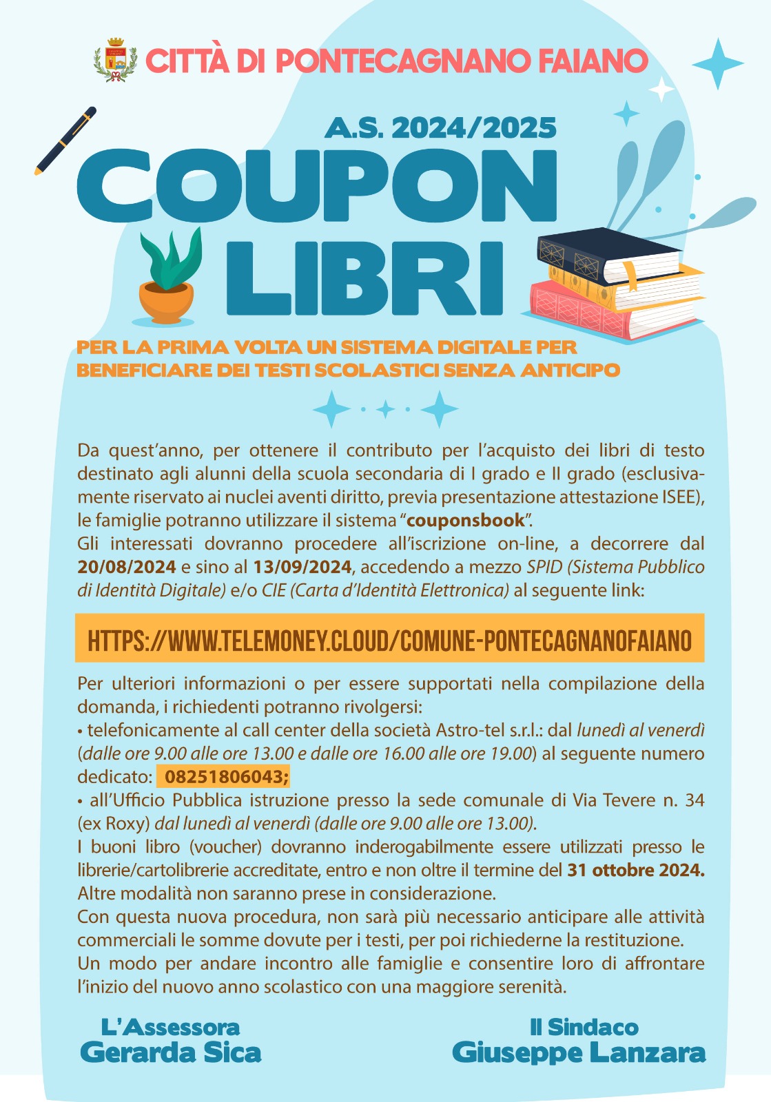 Da quest’anno, invece, sarà possibile utilizzare il sistema “couponsbook”, ovvero lo strumento attraverso cui, procedendo all’iscrizione on-line collegandosi al link https://www.telemoney.cloud/comune-pontecagnanofaiano, i genitori degli alunni o chi ne fa le veci potranno recarsi negli esercizi commerciali convenzionati e richiedere la consegna dei volumi senza effettuare alcun versamento di denaro.