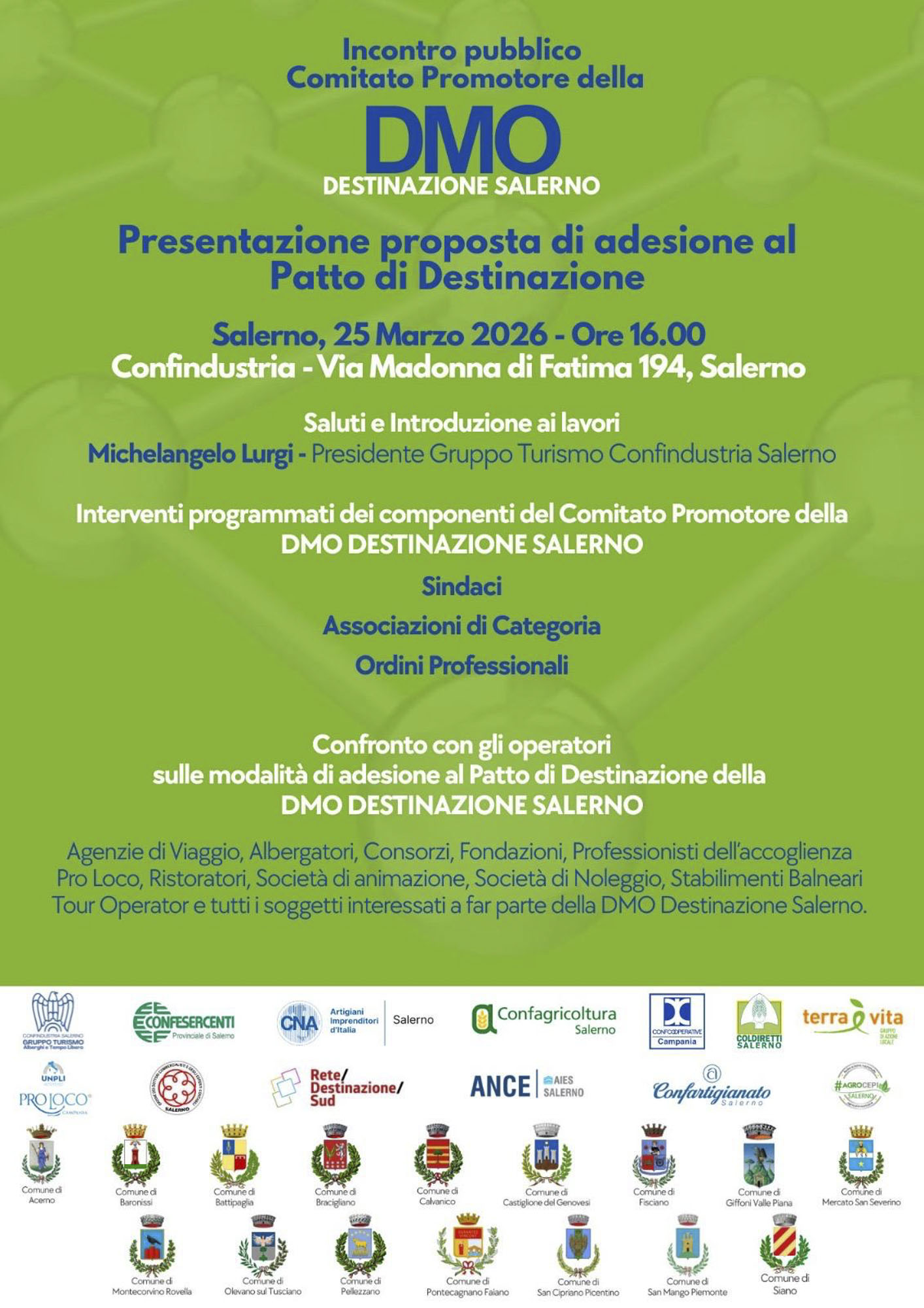 In questo contesto è stato costituito il Comitato Promotore della DMO “Destinazione Salerno”, con l’obiettivo di creare un sistema turistico territoriale unitario, capace di valorizzare in modo coordinato le risorse culturali, ambientali, enogastronomiche e produttive dell’area.