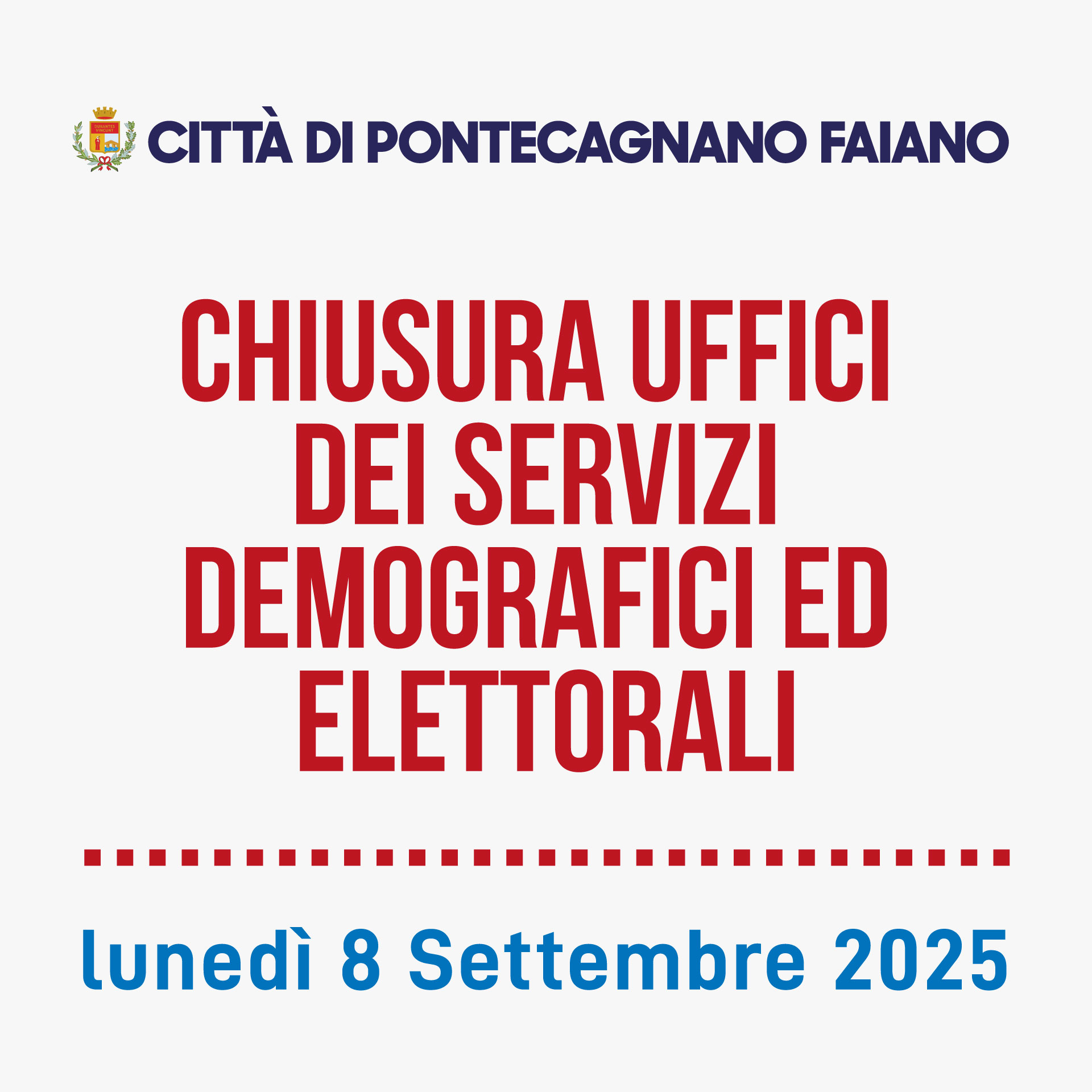 Si avvisa la spettabile utenza che gli uffici dei Servizi Demografici ed Elettorali di via Calabria n. 11, rimarranno chiusi al pubblico il giorno lunedì 08 settembre 2025 causa interruzione energia elettrica e saranno aperti al pubblico mercoledì 10 settembre 2025 dalle ore 9:30 alle ...